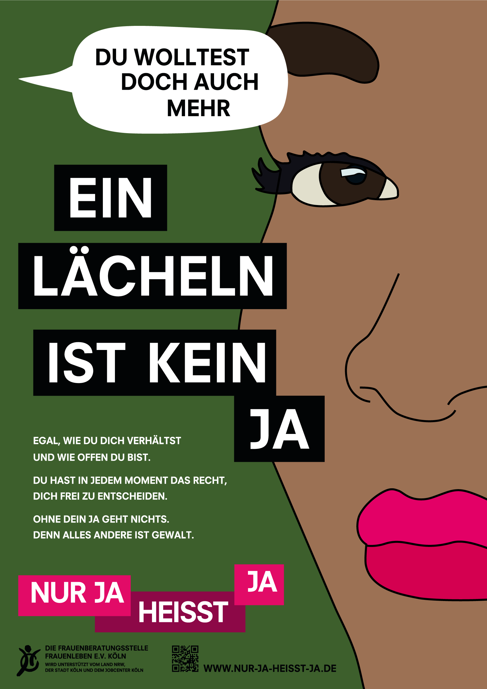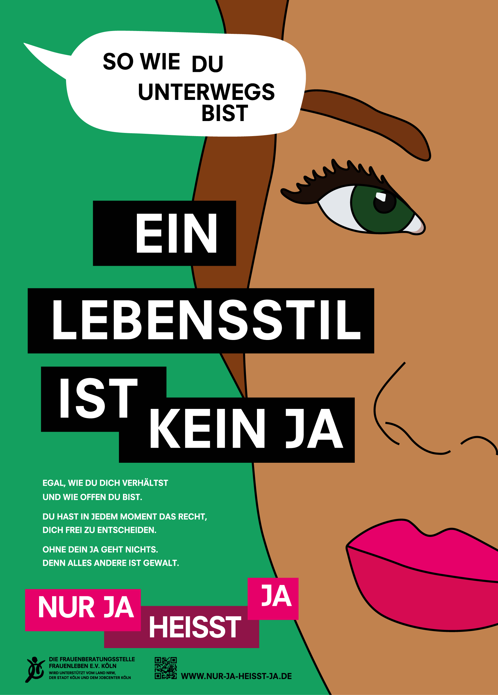 Unsere Plakate "Ein Lächeln ist kein Ja" und "Ein Lebensstil ist kein Ja" beziehen sich auf Consent im Alltag und unser Verhalten. Zum Beispiel wie ausgelassen wir tanzen, ob wir jemandem freundlich den Weg erklären, Verkäufer*innen beim Einkaufen anlächeln: Egal wonach uns ist und wie wir uns geben möchten - Consent kann nie einfach vorausgesetzt werden.