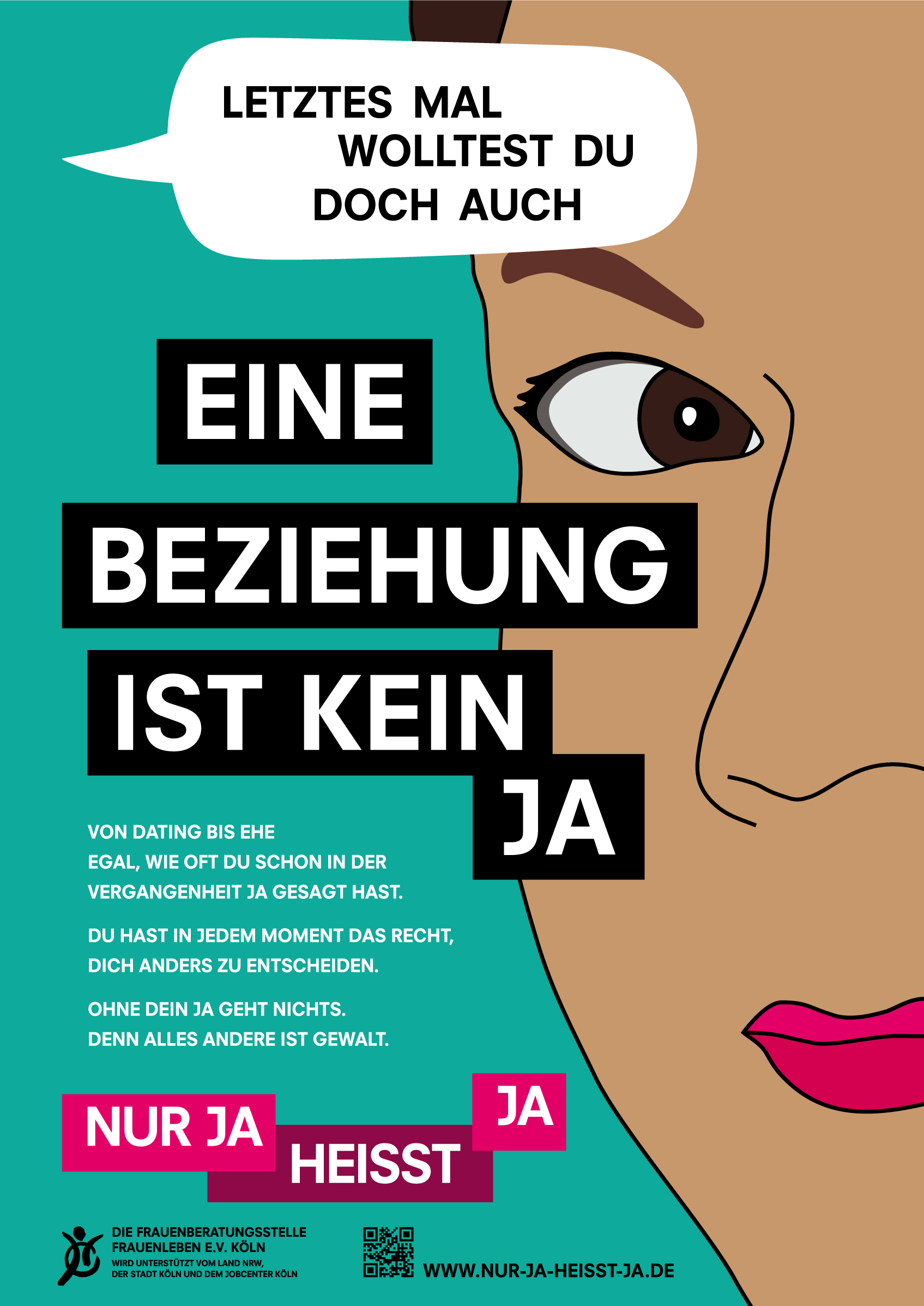 Deshalb sagen wir: Egal, wie oft du schon in der Vergangenheit Ja gesagt hast. Du hast in jedem Moment das Recht, dich anders zu entscheiden. Ohne dein Ja geht nichts. Denn alles andere ist Gewalt.